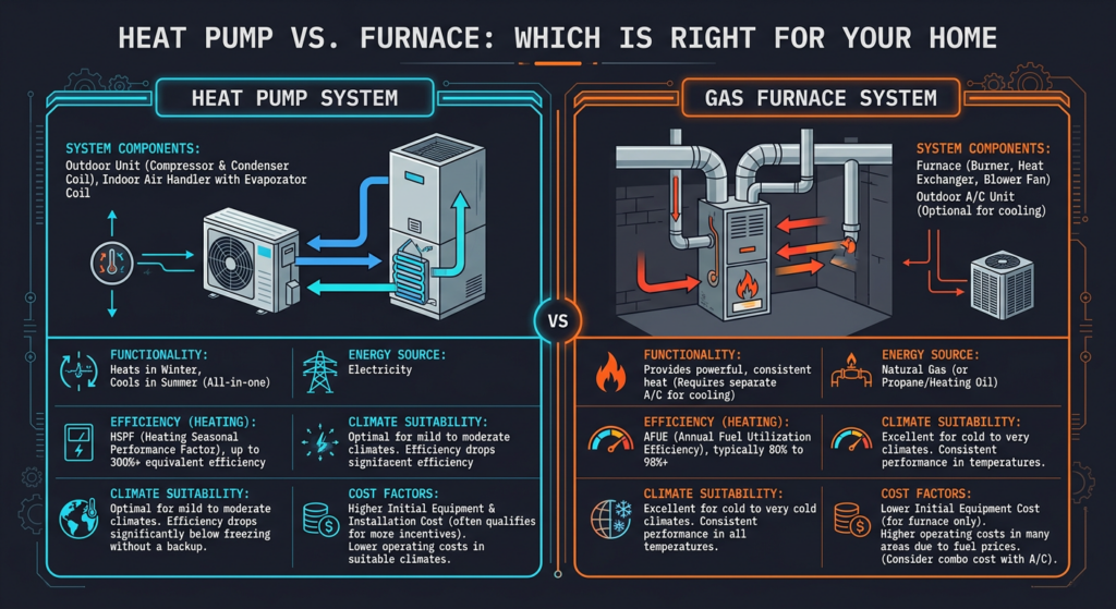 Choosing between a heat pump and a gas furnace is one of the most impactful decisions a homeowner can make. Both heat your home, but they work very differently, cost different amounts to operate, and perform better or worse depending on your climate.