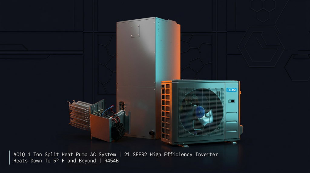 The ACiQ 1 Ton Split Heat Pump AC System delivers efficient heating and cooling with a 21 SEER2 rating and R454B refrigerant. This inverter-driven system is ideal for homeowners and contractors seeking high-efficiency climate control that maintains performance down to 5°F. The smart condenser and air handler communicate with your thermostat to optimize BTU output automatically.