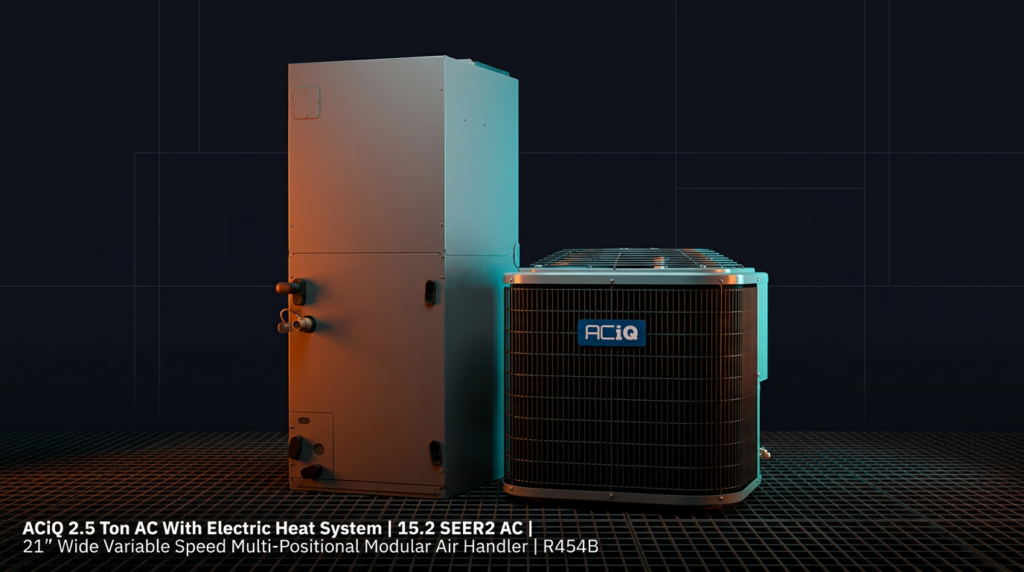 ACiQ 2.5 Ton AC With Electric Heat System | 15.2 SEER2 AC | 21″ Wide Variable Speed Multi-Positional Modular Air Handler | R454B