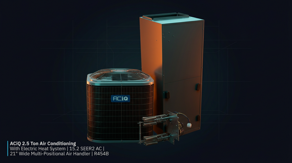 The ACiQ 2.5 Ton Air Conditioning with Electric Heat System delivers 13.4 SEER2 efficiency using R454B refrigerant for modern environmental standards. This system pairs a 2.5-ton condenser with a 21-inch wide multi-positional air handler, making it suitable for homes between 1,200 and 1,500 square feet. The scroll compressor design ensures reliable performance with minimal noise and reduced maintenance needs.