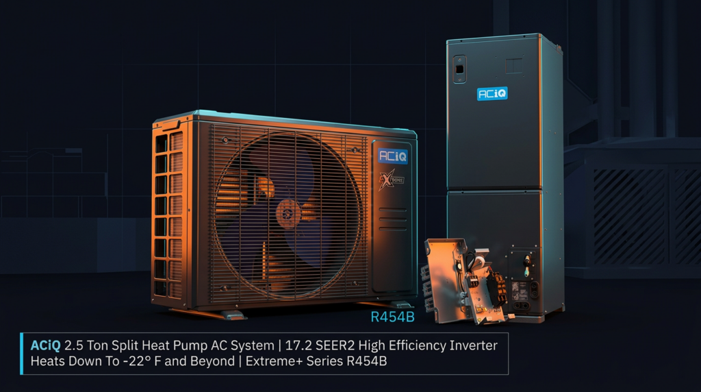 The ACiQ 2.5 Ton Split Heat Pump AC System delivers 17.2 SEER2 efficiency with advanced inverter technology that adjusts compressor speed based on real-time demand. This system heats effectively down to -22°F and beyond, making it suitable for cold climates where traditional heat pumps struggle. The combination of the ACIQ-30-HPD condenser and ACIQ-30-PAH air handler provides reliable heating and cooling for residential applications.
