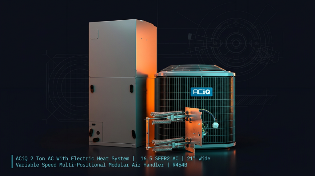 ACiQ 2 Ton AC With Electric Heat System | 16.5 SEER2 AC | 21″ Wide Variable Speed Multi-Positional Modular Air Handler | R454B