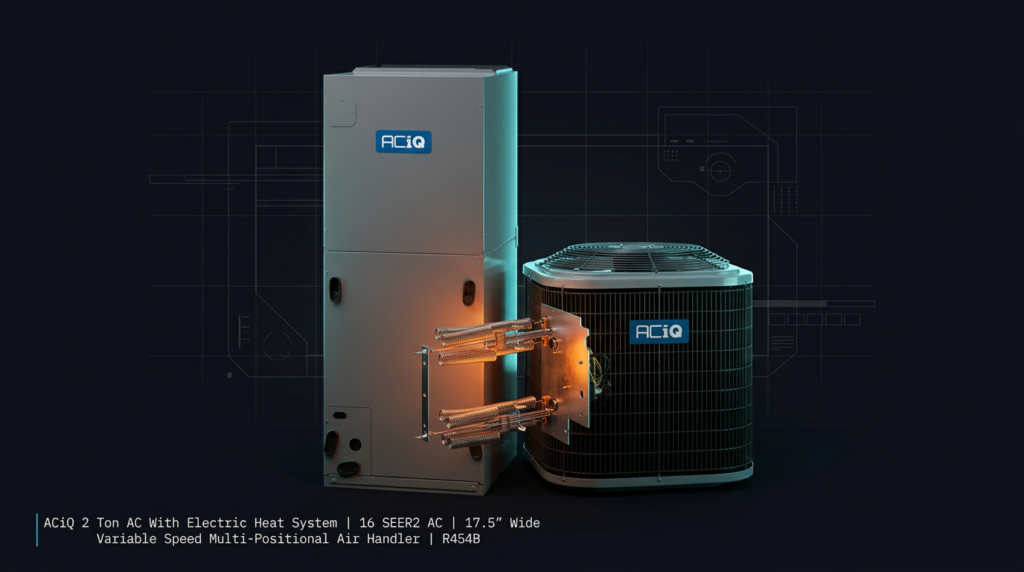 The ACiQ 2 Ton AC With Electric Heat System delivers efficient cooling and heating in a compact package built for homes up to 1,200 sq. ft. This system pairs a 14.3 SEER2 condenser with a variable-speed air handler, offering modern R454B refrigerant compliance and energy savings for homeowners and contractors seeking reliable performance without premium pricing.