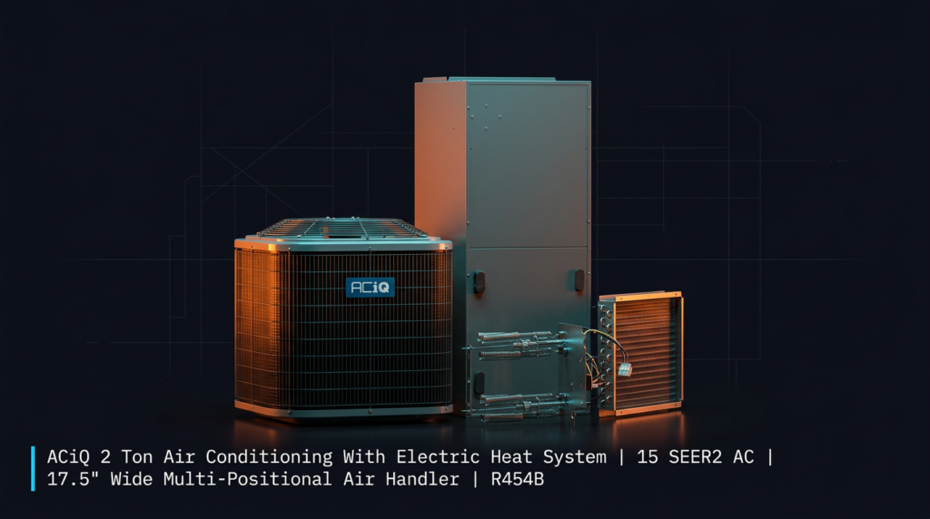 The ACiQ 2 Ton Air Conditioning System with Electric Heat combines a 13.4 SEER2 R454B condenser with a 3-ton multi-positional air handler for efficient cooling and heating in homes between 1,000-1,200 sq. ft. This system meets current EPA refrigerant standards while delivering reliable performance for residential installations requiring both air conditioning and electric heat capability.