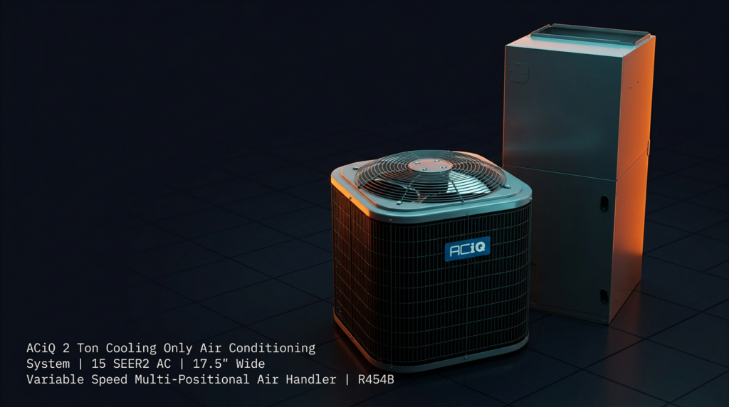 The ACiQ 2 Ton Cooling Only Air Conditioning System pairs the R5A4S24AKANA condenser with the FTMA5X24L0BA air handler to deliver efficient cooling for homes between 1,000 and 1,200 square feet. This system uses R454B refrigerant, which meets current EPA standards while reducing environmental impact. The combination of a 13.4 SEER2 condenser and variable-speed air handler provides both energy savings and reliable comfort control.