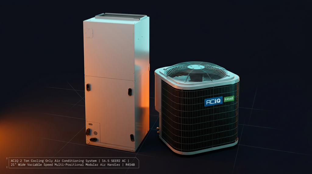 The ACiQ 2 Ton Cooling Only Air Conditioning System combines a 14.3 SEER2 condenser with a variable-speed air handler for efficient residential cooling in homes up to 1,200 sq. ft. This R454B system is built for homeowners and contractors seeking reliable performance with lower energy consumption and reduced environmental impact. The modular design and pre-charged line set make installation straightforward for new construction or replacements.