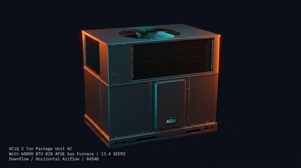 The ACiQ 2 Ton Package Unit combines air conditioning and gas heating in one compact unit, designed for homeowners and contractors needing an all-in-one solution. This downflow/horizontal airflow model delivers 13.4 SEER2 cooling efficiency and 81% AFUE gas heating in a single package, eliminating the need for separate indoor and outdoor equipment.