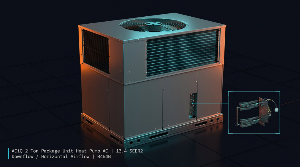 The ACiQ 2 Ton Package Unit Heat Pump AC delivers efficient heating and cooling in a single outdoor unit, designed for downflow and horizontal airflow installations. This R454B system achieves 13.4 SEER2 rating and suits homeowners and contractors seeking reliable climate control with modern refrigerant technology.