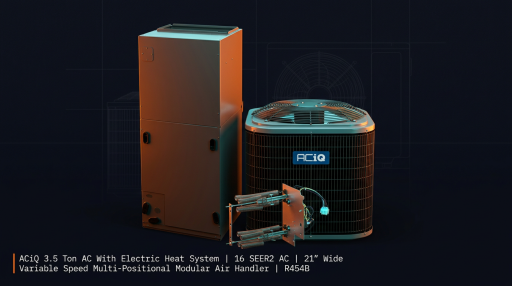 The ACiQ 3.5 Ton AC with Electric Heat System delivers 14.3 SEER2 cooling efficiency using R454B refrigerant, paired with a variable-speed air handler rated for 4-ton capacity. This system is designed for homes between 1,800-2,100 square feet and meets current refrigerant standards while providing reliable comfort and humidity control. The modular configuration allows flexible installation in multiple orientations.
