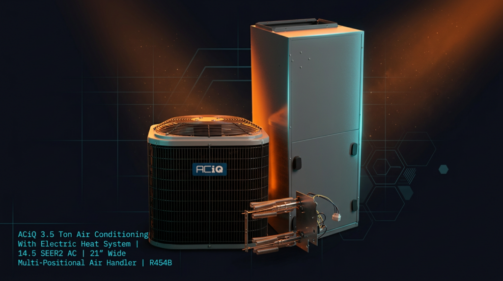 The ACiQ 3.5 Ton Air Conditioning system with electric heat delivers 14.5 SEER2 cooling efficiency in a complete package designed for homes between 1,800 and 2,100 square feet. This system pairs the R5A4S42AKANA condenser with the FHMA5X42L0CA air handler, both optimized for R454B refrigerant. It’s built for homeowners and contractors who need reliable performance with modern environmental compliance and straightforward installation.