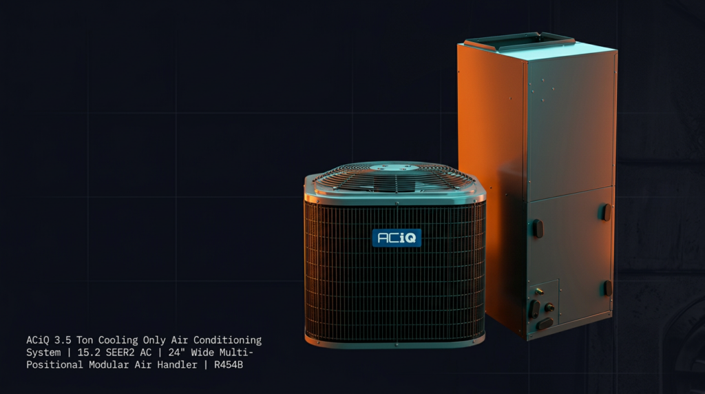 The ACiQ 3.5 Ton Cooling Only Air Conditioning System delivers efficient cooling for homes between 1,800 and 2,100 square feet. This complete package pairs the R5A4S42AKANA condenser with the FHMA5B60L0DA modular air handler, both running on R454B refrigerant for environmental compliance. The 15.2 SEER2 rating reduces energy consumption and operating costs.
