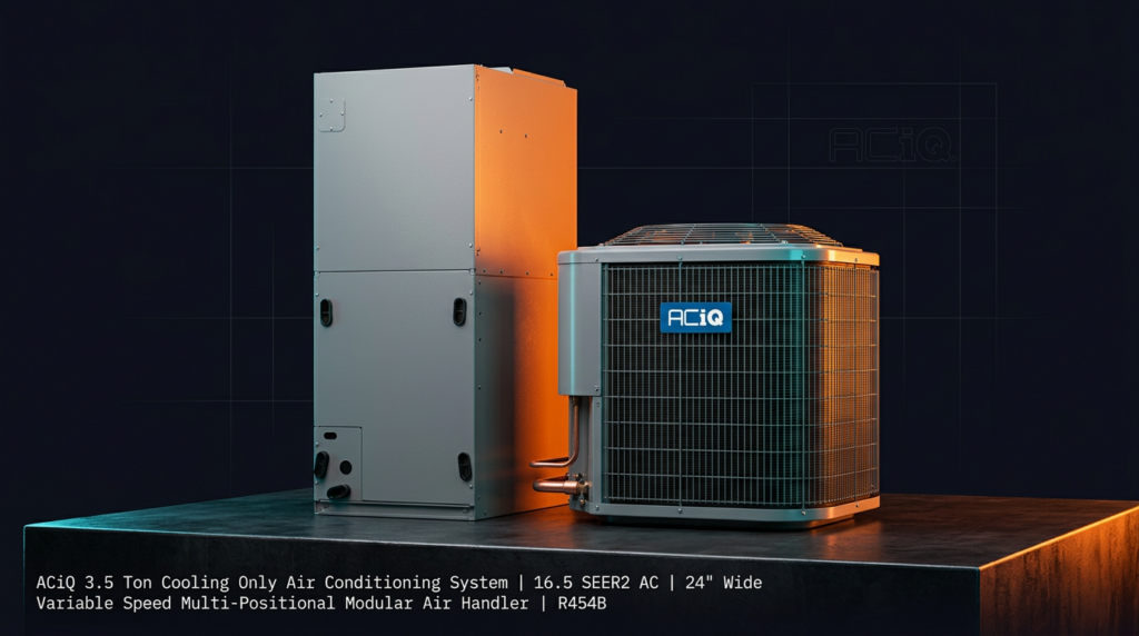 The ACiQ 3.5 Ton Cooling Only Air Conditioning System delivers efficient, eco-friendly cooling for homes between 1,800-2,100 sq. ft. This unit pairs a 14.3 SEER2 condenser with a variable-speed modular air handler and uses R454B refrigerant for future compliance. It’s ideal for homeowners seeking reliable comfort without the complexity of heat pump integration.