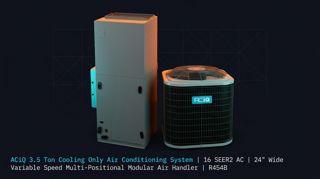The ACiQ 3.5 Ton Cooling Only Air Conditioning System delivers efficient, reliable cooling for homes between 1,800 and 2,100 square feet. This package pairs the R5A4S42AKANA condenser with the FTMA5B60L0DA air handler, using R454B refrigerant to meet current environmental standards. The 16 SEER2 rating helps reduce energy consumption and operating costs.