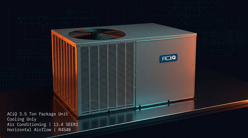 The ACiQ 3.5 Ton Package Unit is a cooling-only air conditioning system designed for residential installations where a compact, efficient solution is needed. This horizontal airflow unit delivers 13.4 SEER2 efficiency using R454B refrigerant, making it suitable for homeowners and contractors seeking reliable performance with modern refrigerant technology.