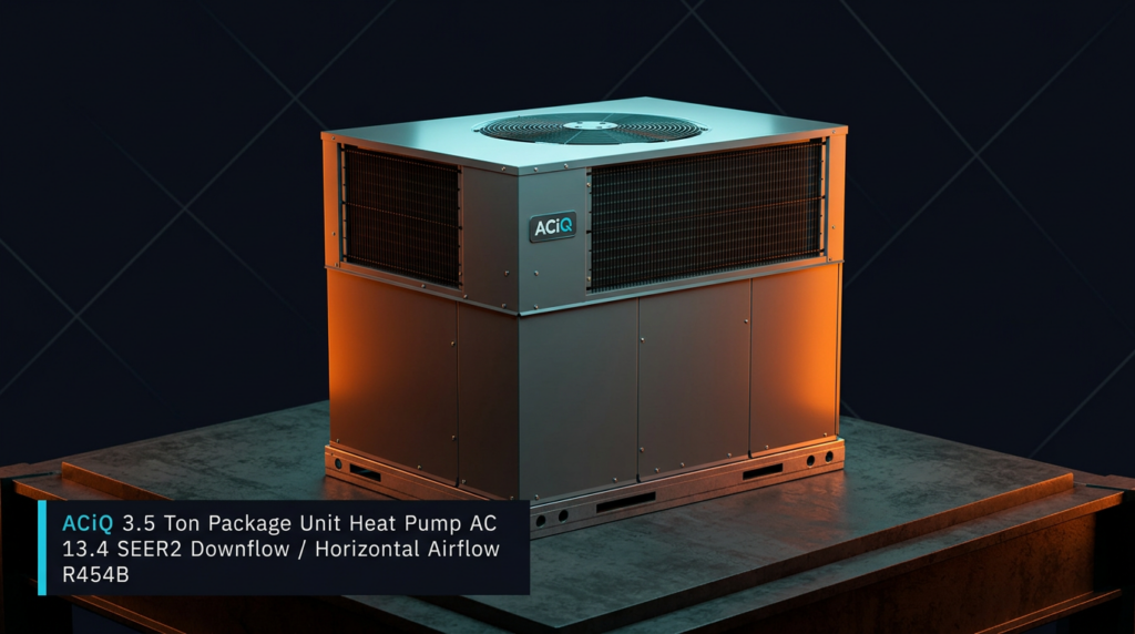 The ACiQ 3.5 Ton Package Unit Heat Pump is a single-cabinet heating and cooling system designed for downflow and horizontal airflow applications. This unit delivers 13.4 SEER2 efficiency using R454B refrigerant, making it suitable for retrofit and new construction projects where space is limited. It operates as a complete system with optional electric heat elements ranging from 5kW to 20kW.