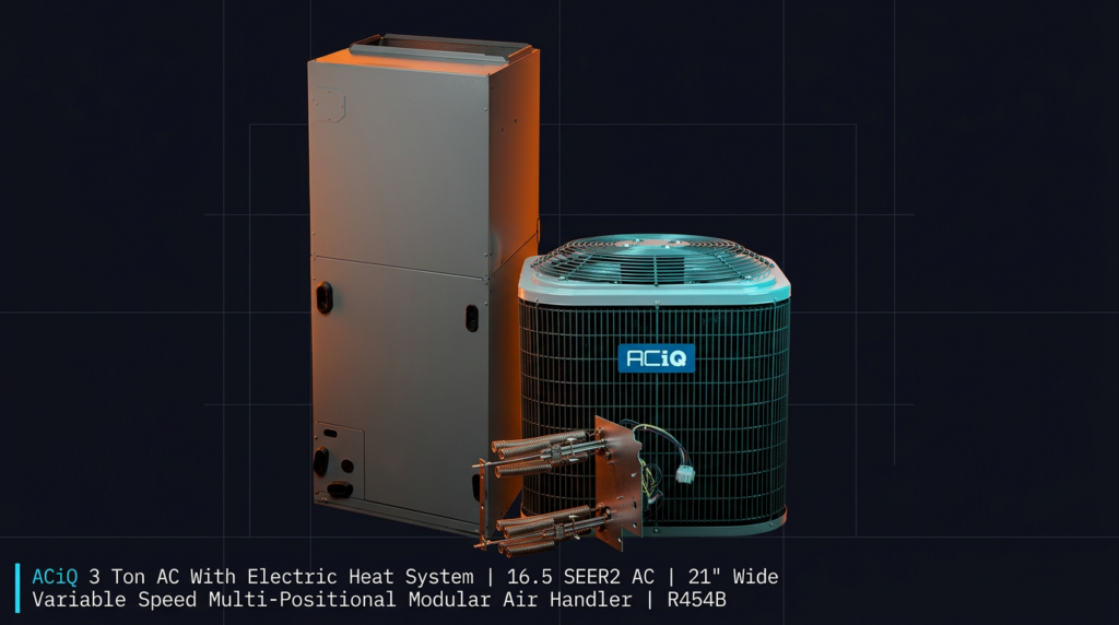 The ACiQ 3 Ton AC with Electric Heat System delivers efficient cooling and heating for homes between 1,500-1,800 sq. ft. This package pairs a 14.3 SEER2 condenser with a variable-speed air handler and optional electric heat kit, providing year-round climate control with R454B refrigerant and modern efficiency standards.