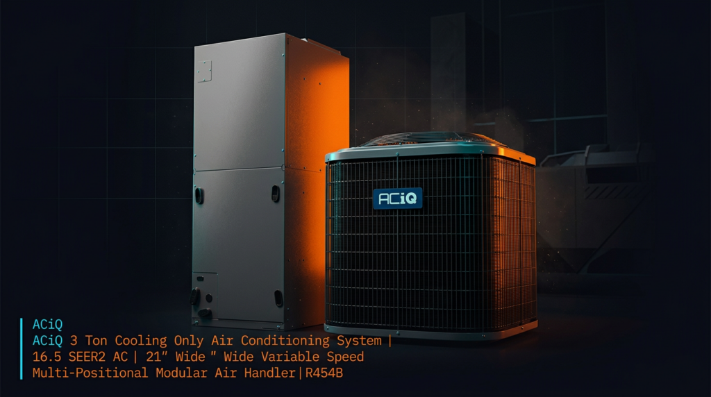 The ACiQ 3 Ton Cooling Only Air Conditioning System combines a 14.3 SEER2 condenser with a variable-speed air handler to deliver efficient cooling for homes between 1,500-1,800 square feet. This R454B system meets DOE 2023 standards while using low-GWP refrigerant, making it an environmentally responsible choice for residential cooling upgrades.