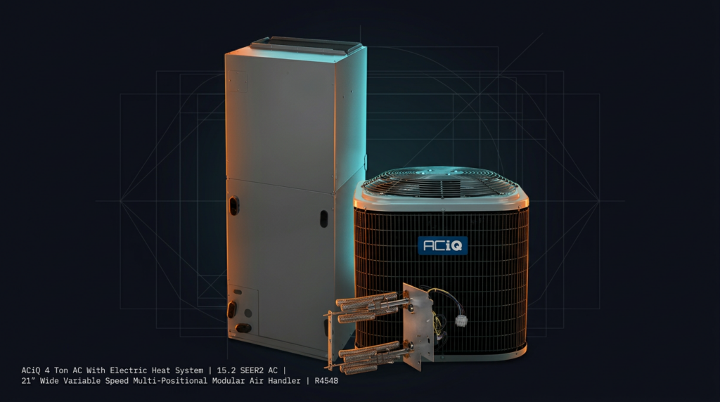 The ACiQ 4 Ton AC with Electric Heat System delivers 15.2 SEER2 cooling efficiency paired with a variable-speed air handler and optional electric heat for complete climate control. This system is designed for homes between 2,100 and 2,500 square feet that require reliable performance and modern energy efficiency. The R454B refrigerant and modular setup make this an environmentally responsible choice for both new installations and system upgrades.