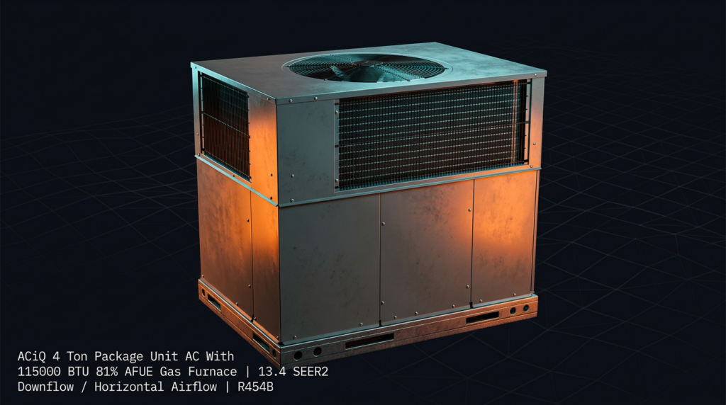 The ACiQ 4 Ton Package Unit combines air conditioning and gas heating in a single, space-saving unit rated at 13.4 SEER2 and 81% AFUE with 115,000 BTU heating capacity. This all-in-one system is ideal for residential installations where a split system is not practical, delivering efficient cooling and heating with R454B refrigerant technology. The downflow/horizontal airflow configuration provides flexible installation options for various home layouts.