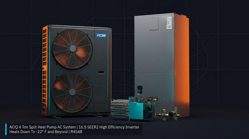 The ACiQ 4 Ton Split Heat Pump AC System is a high-efficiency inverter-driven solution designed for homeowners and contractors seeking reliable heating and cooling with extreme cold-weather capability. This system combines the ACIQ-48-HPD condenser and ACIQ-48-AHD air handler to deliver 16.5 SEER2 efficiency while maintaining heating performance down to -22 degrees Fahrenheit and beyond. The inverter technology automatically adjusts compressor speed based on demand, reducing energy consumption and operating costs year-round.