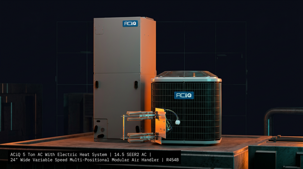 The ACiQ 5 Ton AC with Electric Heat System delivers 14.5 SEER2 cooling efficiency for homes and light commercial spaces 2,500+ square feet. This complete package pairs the R5A4S60AKANA condenser with the FTMA5B60L0DA air handler, both optimized for R454B refrigerant and designed for reliable, quiet operation. Add an optional electric heat kit up to 30kW for year-round comfort.
