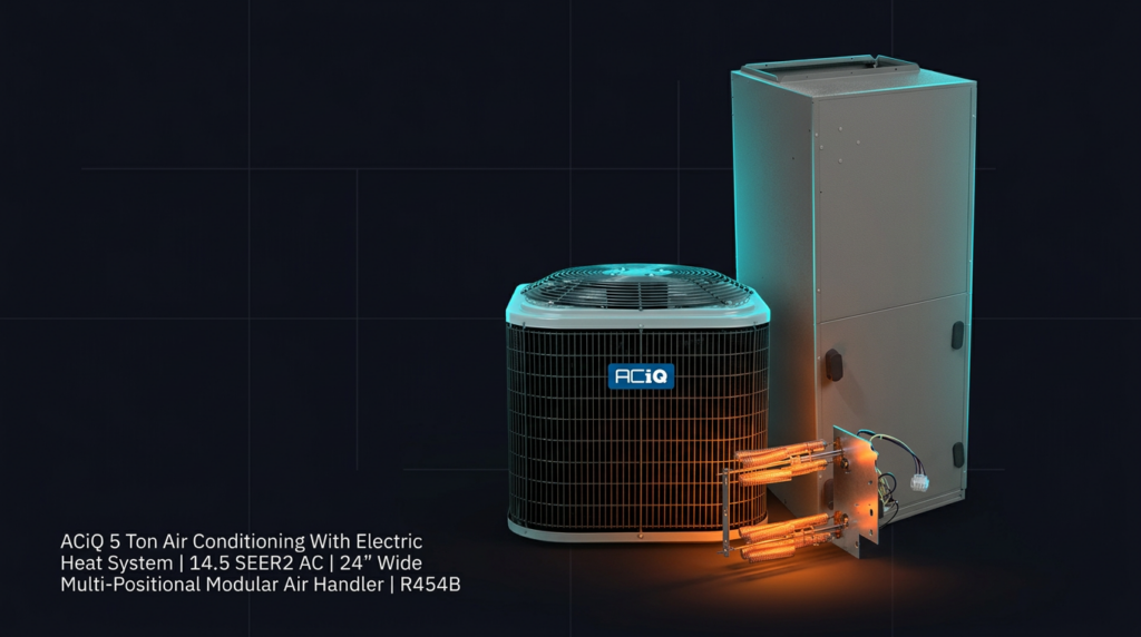 The ACiQ 5 Ton Air Conditioning system with electric heat combines a 13.4 SEER2 R454B condenser with a modular air handler to deliver efficient cooling and heating for homes over 2,500 square feet. This system is engineered for professionals who need reliable performance in large residential or light commercial applications. The modular design and low-GWP refrigerant meet current environmental standards while maintaining manageable energy costs.