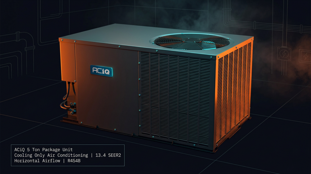 The ACiQ 5 Ton Package Unit is a cooling-only air conditioning system designed for residential installations where space efficiency matters. This horizontal airflow unit delivers 13.4 SEER2 efficiency using R454B refrigerant, making it suitable for homeowners and contractors seeking reliable cooling performance in a compact footprint.
