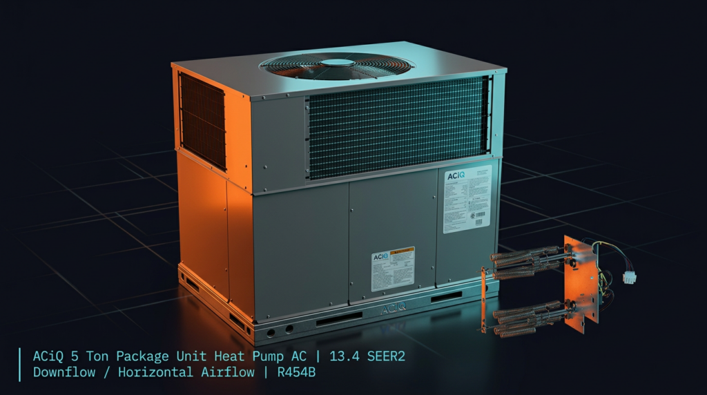 The ACiQ 5 Ton Package Unit Heat Pump AC delivers 13.4 SEER2 efficiency in a single rooftop or ground-mounted unit with both heating and cooling capability. This R454B system is ideal for new construction or retrofit applications where a compact, all-in-one solution eliminates the need for separate indoor and outdoor equipment. The downflow/horizontal airflow configuration provides flexible installation options for various duct layouts.