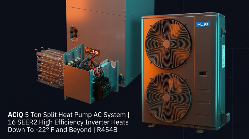 The ACiQ 5 Ton Split Heat Pump AC System is an inverter-driven heating and cooling solution rated at 16 SEER2 efficiency with the capacity to deliver heating performance down to -22 degrees Fahrenheit and beyond. This system is engineered for homeowners and contractors seeking high-efficiency climate control in cold climates without sacrificing cooling performance during warm months.