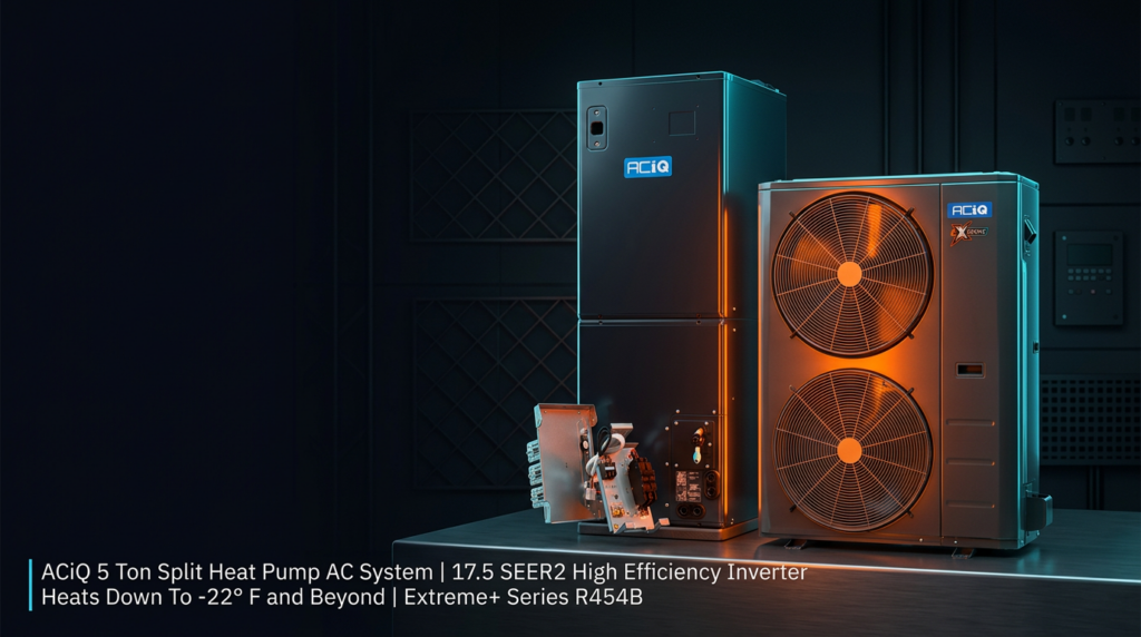 The ACiQ 5 Ton Split Heat Pump AC System delivers 17.5 SEER2 efficiency with inverter-driven technology that adapts cooling and heating output in real time. This system heats effectively down to -22 degrees F, making it suitable for cold climates where traditional heat pumps struggle. The Extreme+ Series uses R454B refrigerant and combines the ACIQ-60-HPD condenser with the ACIQ-60-PAH air handler for reliable year-round comfort.
