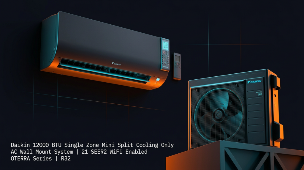 The Daikin 12000 BTU Single Zone Mini Split Cooling Only AC Wall Mount System delivers efficient spot cooling for small rooms, home offices, and additions. This OTERRA series unit combines a 21 SEER2 rating with R32 refrigerant technology to provide energy savings and environmental benefits in a compact, space-saving design.