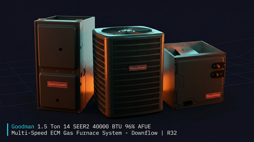 The Goodman 1.5 Ton 14 SEER2 40000 BTU 96% AFUE Multi-Speed ECM Gas Furnace System delivers efficient heating and cooling in a downflow configuration using R32 refrigerant. This complete system combines a high-efficiency condenser, gas furnace, and evaporator coil, making it ideal for homeowners and contractors seeking reliable performance with lower operating costs. The 96% AFUE rating and 14 SEER2 efficiency mean reduced energy consumption without compromising comfort.