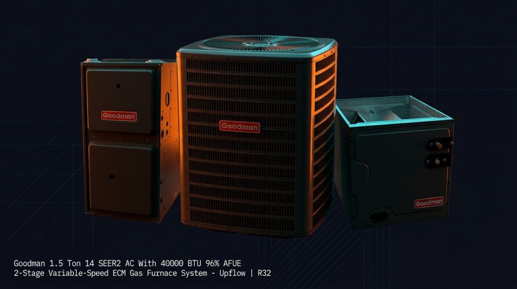 The Goodman 1.5 Ton 14 SEER2 AC with 40000 BTU 96% AFUE 2-Stage Variable-Speed ECM Gas Furnace System delivers efficient cooling and heating in a single upflow configuration. This R32 system is factory-charged for 15 feet of tubing and includes a communicating furnace with ComfortBridge technology. It’s designed for homeowners and contractors seeking reliable performance with low operating costs.
