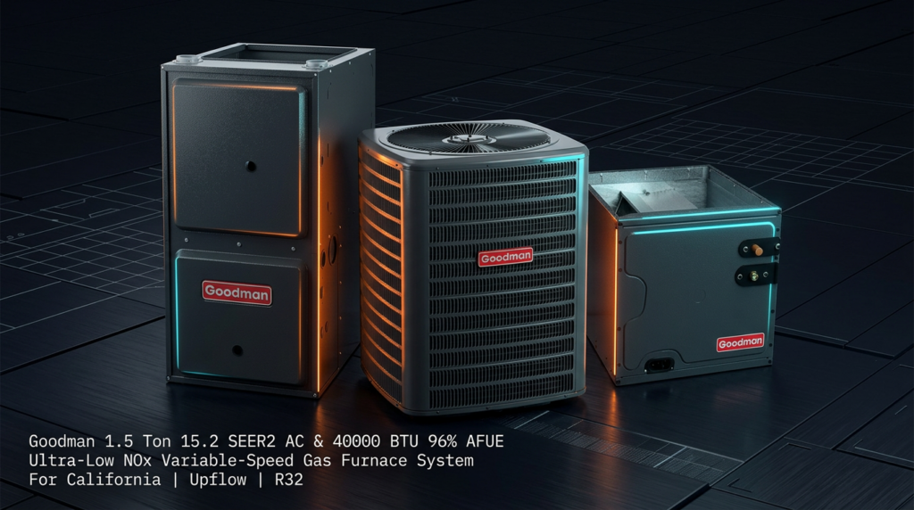 The Goodman 1.5 Ton 15.2 SEER2 AC and 40000 BTU 96% AFUE Ultra-Low NOx Variable-Speed Gas Furnace System is a California-compliant combination unit designed for homeowners in SCAQMD and SJVUAPCD districts who need both cooling and heating. This system pairs a high-efficiency air conditioner with a furnace that meets strict NOx emission limits while delivering reliable performance and energy savings.