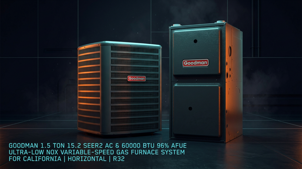 The Goodman 1.5 Ton 15.2 SEER2 AC and 60000 BTU 96% AFUE Ultra-Low NOx Variable-Speed Gas Furnace System delivers high-efficiency cooling and heating in a single package designed specifically for California compliance. This R32 horizontal system meets strict NOx emission limits for both SCAQMD and SJVUAPCD districts, making it ideal for HVAC professionals installing in regulated air quality management areas.