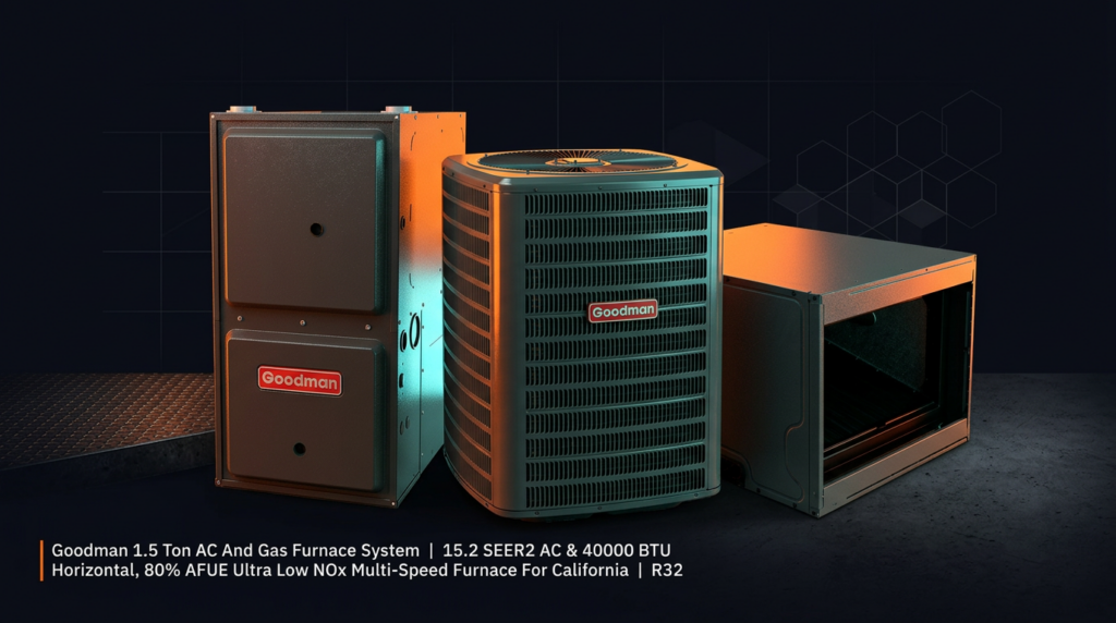 Goodman 1.5 Ton AC And Gas Furnace System | 15.2 SEER2 AC & 40000 BTU Horizontal, 80% AFUE Ultra Low NOx Multi-Speed Furnace For California | R32