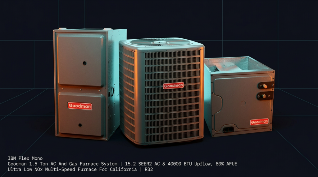 Goodman 1.5 Ton AC And Gas Furnace System | 15.2 SEER2 AC & 40000 BTU Upflow, 80% AFUE Ultra Low NOx Multi-Speed Furnace For California | R32