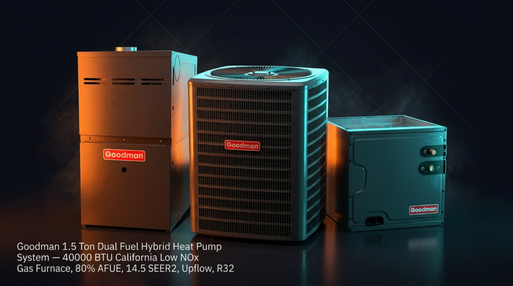 The Goodman 1.5 Ton Dual Fuel Hybrid Heat Pump System combines the GLZS4BA1810 heat pump condenser with the GR9S800403AX gas furnace for year-round comfort in smaller residential spaces. This system delivers 18,000 BTU of cooling capacity at 15.2 SEER2 efficiency and switches to gas heating for maximum output during cold weather, making it ideal for homeowners in Low NOx emissions regions.