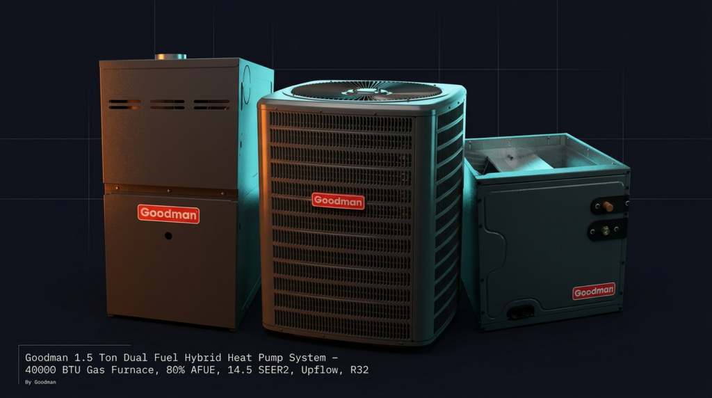 Goodman 1.5 Ton Dual Fuel Hybrid Heat Pump System – 40000 BTU Gas Furnace, 80% AFUE, 14.5 SEER2, Upflow, R32