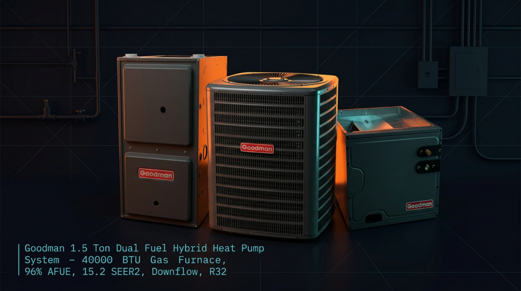 Goodman 1.5 Ton Dual Fuel Hybrid Heat Pump System – 40000 BTU Gas Furnace, 96% AFUE, 15.2 SEER2, Downflow, R32