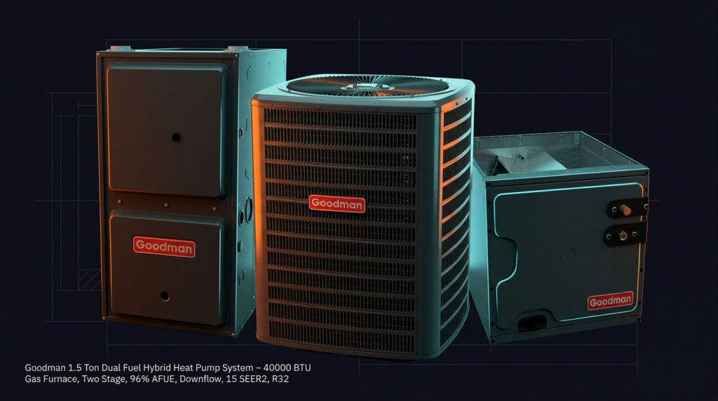 Goodman 1.5 Ton Dual Fuel Hybrid Heat Pump System – 40000 BTU Gas Furnace, Two Stage, 96% AFUE, Downflow, 15 SEER2, R32