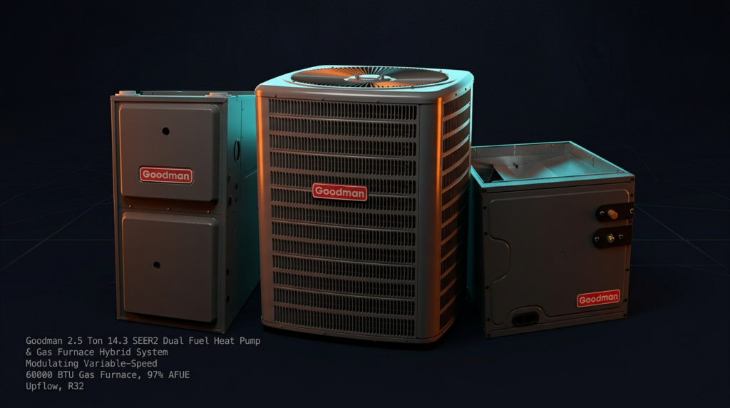 The Goodman 2.5 Ton 14.3 SEER2 Dual Fuel Heat Pump and Gas Furnace Hybrid System combines efficient heat pump cooling with a high-output gas furnace for year-round comfort in moderate climates. This system delivers 30,000 BTU of cooling capacity and 60,000 BTU of heating output, making it ideal for homeowners seeking lower energy costs without sacrificing heating performance during cold months. The R32 refrigerant and 97% AFUE gas furnace provide substantial utility savings.