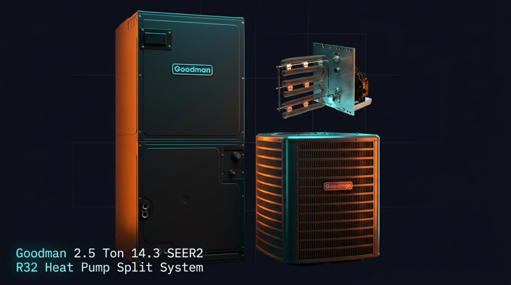 The Goodman 2.5 Ton 14.3 SEER2 R32 Heat Pump Split System delivers high-efficiency heating and cooling with environmentally responsible R32 refrigerant. This system is ideal for homeowners seeking energy savings and reliable performance in a compact, cost-effective package. The combination of advanced compressor technology and optimized coil design provides quiet operation and consistent comfort year-round.