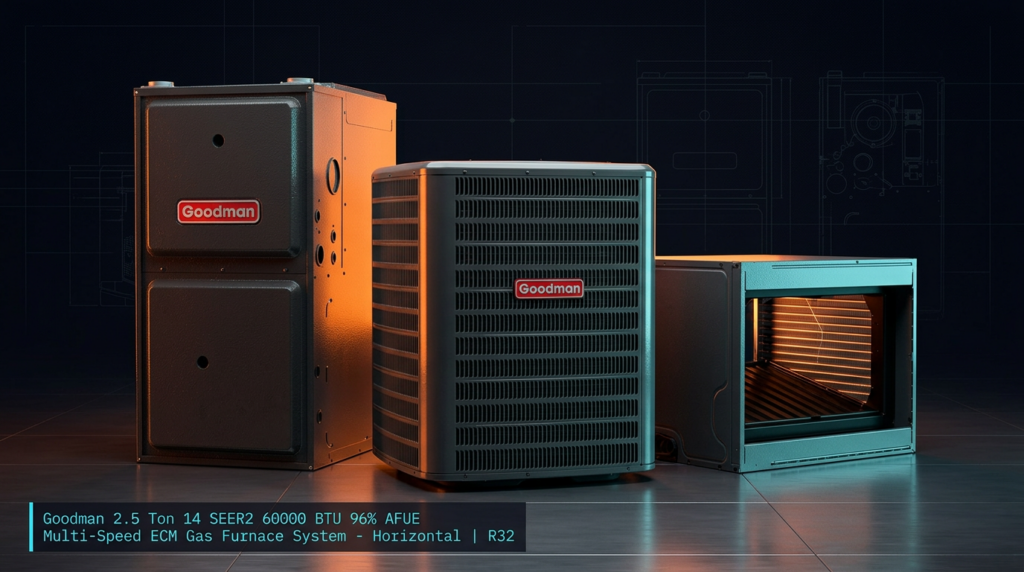 The Goodman 2.5 Ton 14 SEER2 Multi-Speed ECM Gas Furnace System delivers efficient heating and cooling for residential applications. This horizontal R32 system combines a high-efficiency furnace with a matched condenser unit, offering 96% AFUE and 60,000 BTU heating capacity. It is designed for homeowners and contractors seeking reliable performance with lower operating costs.