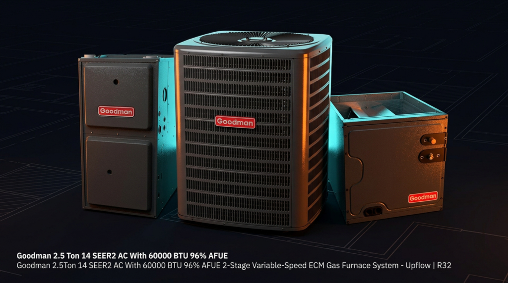 The Goodman 2.5 Ton 14 SEER2 AC with 60000 BTU 96% AFUE 2-Stage Variable-Speed ECM Gas Furnace System delivers efficient heating and cooling for upflow installations using R32 refrigerant. This all-in-one system pairs a high-efficiency air conditioner with a modulating gas furnace, making it ideal for homeowners seeking lower energy bills without sacrificing comfort. The variable-speed blower and two-stage heating operation reduce runtime costs while maintaining consistent temperatures year-round.
