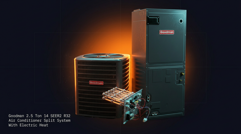 The Goodman 2.5 Ton 14 SEER2 R32 Air Conditioner Split System with Electric Heat delivers efficient cooling and heating for residential applications. This R32-optimized system combines a high-efficiency condenser unit with a compatible air handler and electric heating element. It’s designed for contractors and homeowners seeking reliable performance with modern refrigerant technology.