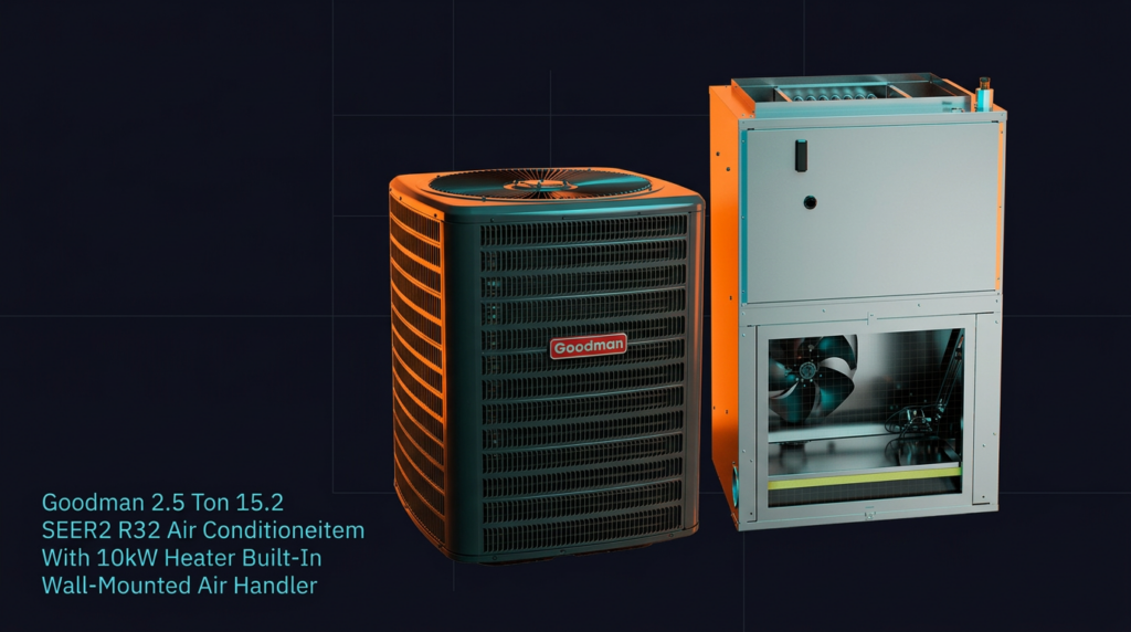 The Goodman 2.5 Ton 15.2 SEER2 R32 Split System combines a high-efficiency GLXS4B condenser with an AWST30LU wall-mounted air handler featuring 10kW built-in electric heating. This system delivers modern refrigerant efficiency with R32 technology and is ideal for residential applications requiring both cooling and heating capacity in a compact footprint.