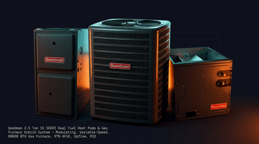 The Goodman 2.5 Ton 15 SEER2 Dual Fuel Heat Pump and Gas Furnace Hybrid System combines high-efficiency heat pump operation with a 97% AFUE modulating gas furnace for year-round comfort in mixed climates. This system is ideal for contractors and homeowners seeking superior efficiency and flexibility, with the heat pump handling mild weather and the furnace providing reliable backup during cold snaps. The R32 refrigerant, variable-speed components, and SmartShift technology deliver both energy savings and quiet operation.