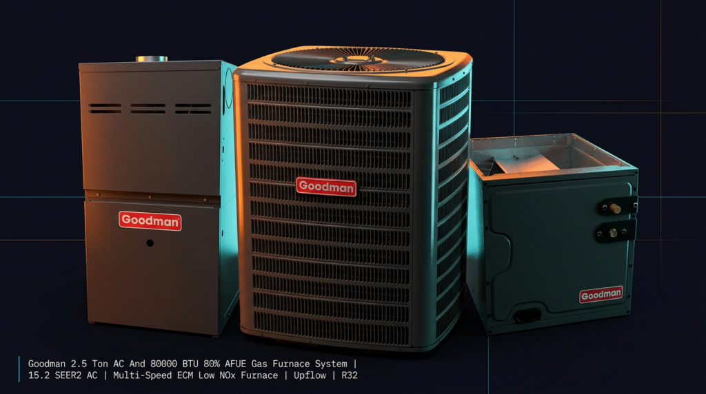 The Goodman 2.5 Ton AC and 80,000 BTU 80% AFUE Gas Furnace System delivers efficient heating and cooling for residential applications. This upflow configuration combines a 15.2 SEER2 R32 condenser with a multi-speed ECM low NOx furnace, offering both performance and compliance with modern efficiency standards.