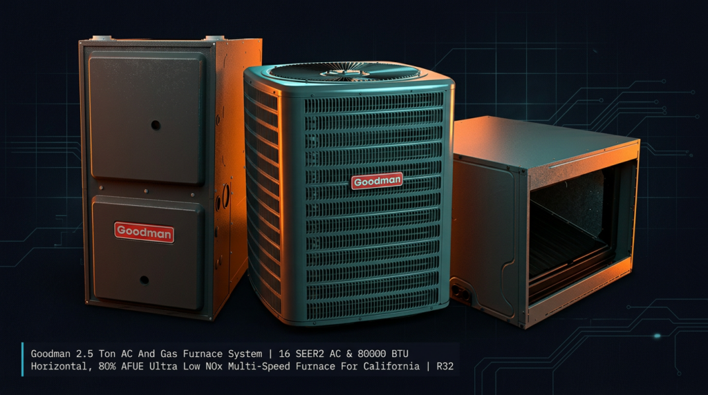 Goodman 2.5 Ton AC And Gas Furnace System | 16 SEER2 AC & 80000 BTU Horizontal, 80% AFUE Ultra Low NOx Multi-Speed Furnace For California | R32